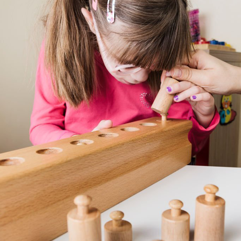 Utilizzando i cilindri, il bambino riesce a comprendere che c’è un diretto rapporto tra la dimensione dei vari incastri, acquisendo così la capacità di distinzione tra i concetti come: