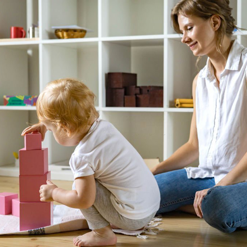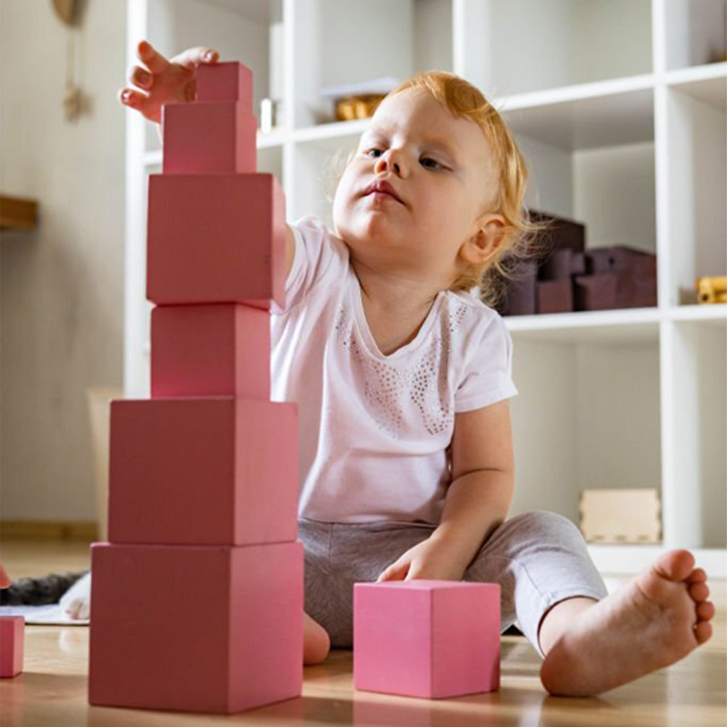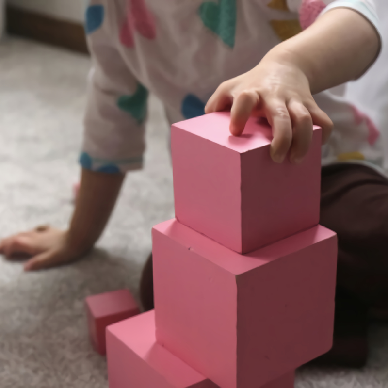 “Una serie di cubi il cui spigolo è degradante da 10 cm ad 1 cm. Di colore rosa vivace, presenta gli oggetti differenti secondo le tre dimensioni, cioè grandi e più piccoli. Sul tappeto si pone prima il cubo maggiore, poi l’uno sull’altro tutti gli altri, costruendo una specie di torre. Demolita, si ricostruisce’’.